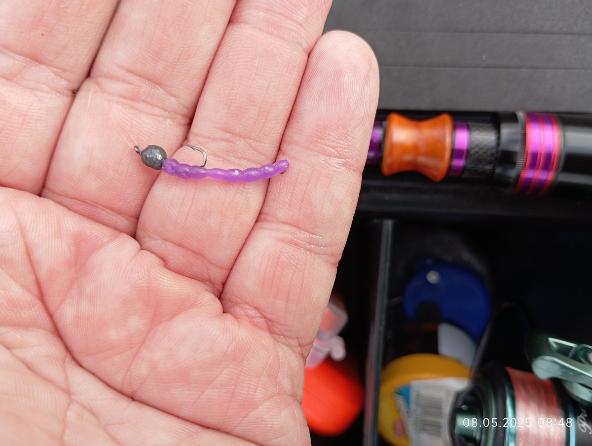 Всем доброго времени суток! Вчера 08.05.2025 удалось между делом и работой немного покидать мормышку. Сначала заехал на реку Грязнуху. Собрал снасть, поставил в качестве приманки малинку в цвете фиолет