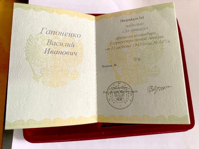 Накануне празднования 80-летия Победы в военном комиссариате Таганрога Сергею Жардецкому и его дочери Анастасии Бутенко торжественно вручили удостоверение о награждении медалью «За отвагу» их деда и прадеда, участника Великой Отечественной войны Василия Ивановича Гапоненко. Произошло это благодаря настойчивости Сергея и Анастасии, их неравнодушию к истории семьи. Девушка с детства помнила рассказы своей бабушки Тамары Васильевны о том, что ее отцу Василию Гапоненко так и не вручили медаль «За отвагу», к награждению которой командование представило его в 1943 году. Решили начать поиск на сайтах «Подвиг народа» и «Память народа». Только всё оказалось не так просто. Выяснилось, что однофамильцев участника войны с таким же именем-отчеством, воевавших в разведке, немало. Своего определили методом исключения: по дате и месту рождения, призыва. Наконец, многодневные труды увенчались успехом. Окончательно убедились, что нашли именно деда и прадеда, после прочтения наградных листов. Анастасия Б