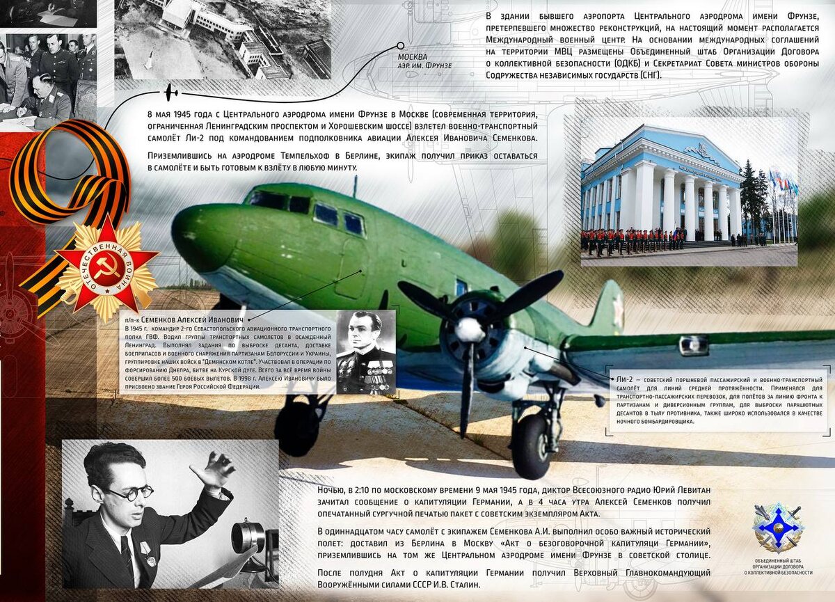 9 мая 1945 года на центральный аэродром им. М.В.Фрунзе приземлился Ли-2 А.И.Семенкова, доставивший в Москву акт о безоговорочной капитуляции фашисткой Германии.