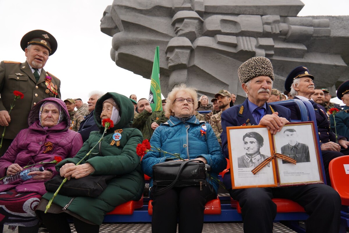 У мемориального комплекса «Родина-Мать» в 9.25 началось выступление хора, сводного оркестра духовых и народных инструментов. С раннего утра здесь собрались тысячи жителей, и погода радует несмотря на отсутствие солнца. До начала парада Победы возле мемориального комплекса «Родина-мать» Вахту Памяти несли руководители городских организаций и предприятий города. В завершении Вахту Памяти приняли заместитель Премьер-министра, министр промышленности и торговли Олег Коробченко и мэр города Набережные Челны Наиль Магдеев. Фото: Евгения Катушенок/«Челнинские известия», телеграм-канал пресс-службы мэрии Набережных Челнов