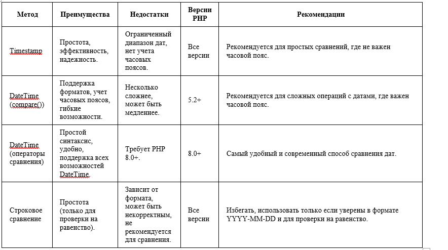 В PHP существует несколько способов сравнить даты. Выбор метода зависит от формата дат, ваших потребностей в точности и доступных версий PHP. 1. Сравнение дат в формате timestamp (Unix timestamp): Timestamp - это целое число, представляющее количество секунд, прошедших с начала эпохи Unix (1 января 1970 года 00:00:00 UTC). Это самый простой и надежный способ сравнения дат в PHP. · $date1 = strtotime("2023-10-27"); · $date2 = time(); // Текущее время · $date3 = mktime(0, 0, 0, 12, 25, 2023); // 25 декабря 2023 · · if ($date1 > $date2) { · echo "2023-10-27 больше, чем текущая дата"; · } elseif ($date1 < $date2) { · echo "2023-10-27 меньше, чем текущая дата"; · } else { · echo "2023-10-27 равна текущей дате"; · } · · if ($date1 > $date3) { · echo "2023-10-27 больше, чем 2023-12-25"; · } else { · echo "2023-10-27 меньше или равна 2023-12-25"; · } 2. Сравнение дат с использованием объектов DateTime (PHP 5.2+): Класс DateTime предоставляет более мощные и гибкие возможности для работы с