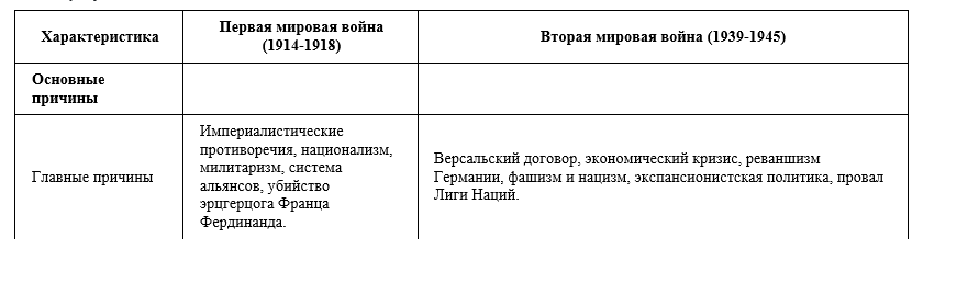 Первая мировая война (1914-1918) и Вторая мировая война (1939-1945) — два самых масштабных и разрушительных конфликта в истории человечества. Несмотря на то, что они произошли в разные исторические периоды, они связаны между собой рядом причин и последствий. Сравнение этих войн помогает лучше понять их природу и влияние на мир. Таблица сравнения: Подробное сравнение: Ключевые различия: Связь между войнами: Вторая мировая война была во многом следствием нерешенных проблем после Первой мировой войны. Версальский договор, который завершил Первую мировую войну, был воспринят Германией как несправедливый и унизительный, что способствовало подъему реваншистских настроений и приходу к власти нацистов. Экономический кризис 1929 года также сыграл важную роль в дестабилизации политической ситуации в Европе и укреплении позиций экстремистских сил. В заключение: Первая и Вторая мировые войны — это два трагических события в истории человечества, которые имели глубокие и долговременные последствия.