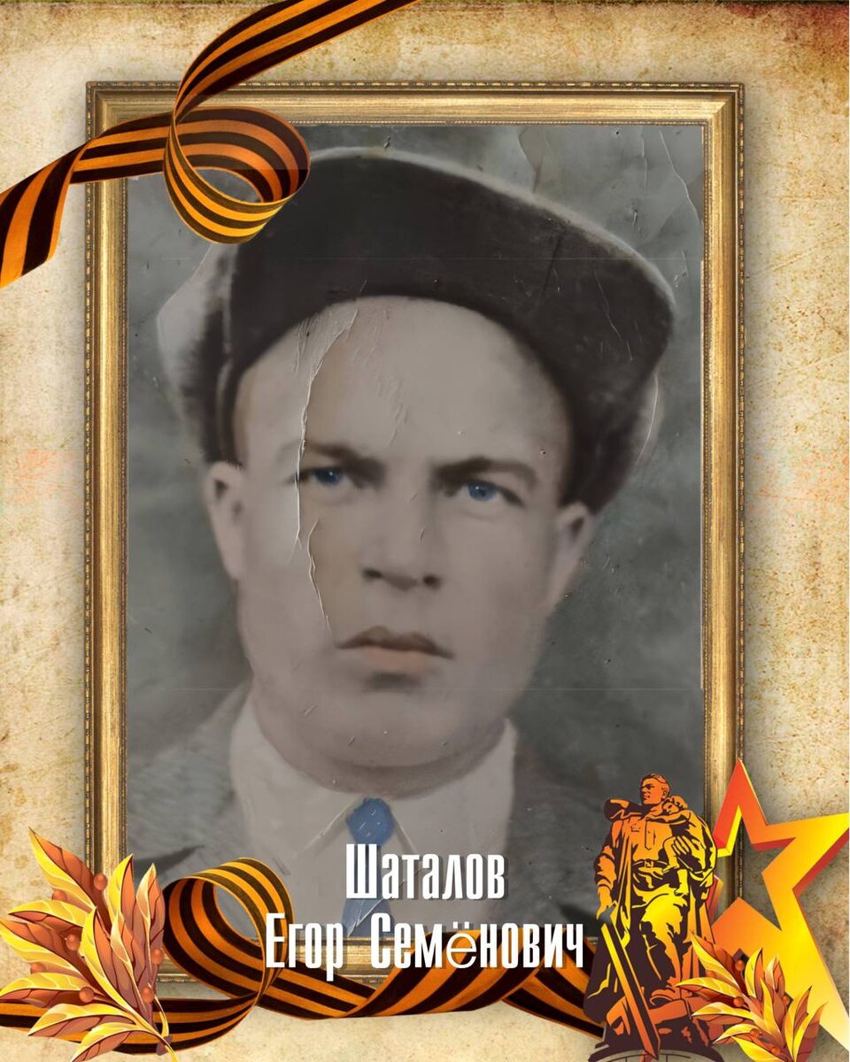 Шаталов Егор Семёнович Родился в 1914 году в селе Ледовское, Курская область Служил в 1069-м стрелковом полку 311-й стрелковой дивизии 1942 безвестие пропал. По информации погиб под Питером в 1942 году.