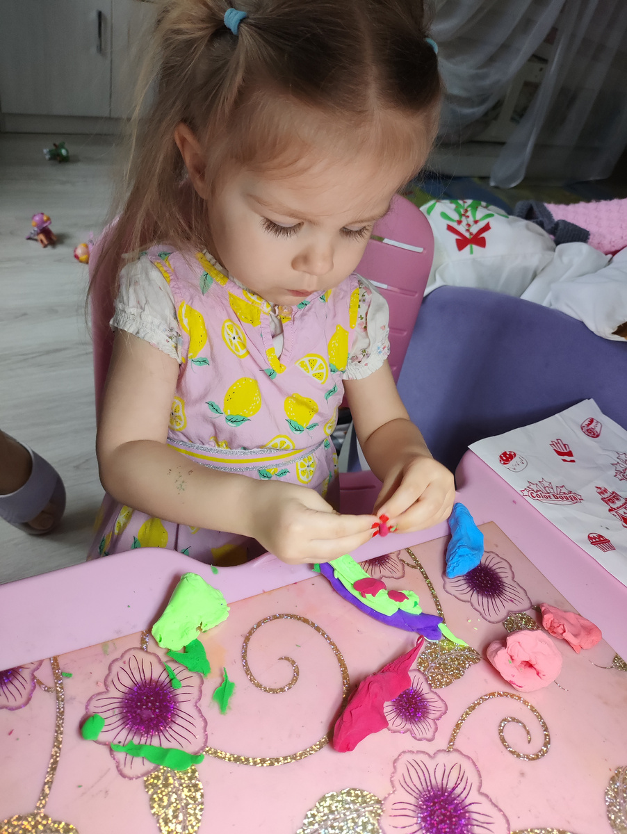 Поздравляю с Днём Победы! Цените каждый миг, проведенный в кругу семьи, вместе с родными и близкими❤️. Пусть дома звучит только радостный детский смех, а над нами будет только мирное небо🕊️💙 Никто не забыт, ничто не забыто... В четверг с девчонками остались одни. После трёх дней подряд, проведенных в саду, было необычно, что весь день надо было чем-то заниматься всем вместе, ещё и без мужа. Папу нашего забрали на дачу для капательных работ на участке. Накапал ямы, ещё и сосиски, шашлыки пожарил. А мы тем временем, проводили папу за порог и сразу начали заниматься лёгким пластилином. Я решила дать им полную свободу для творчества и фантазии. Они так долго и усердно что-то самостоятельно делали, я даже вздохнула от облегчения. Встают они у меня очень рано, даже в праздничные дни. Подъём раньше семи утра- это нормально для наших праздников и будней, а я ещё и раньше встаю (кто-то разбудил под утро и дальше спать, а мне уже и сон не идёт). У Агаты по задумке была лошадь и даже нечто по