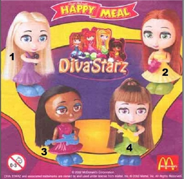 Серия кукол с аксессуарами Diva Starz 2002 в McDonald's включает в себя: