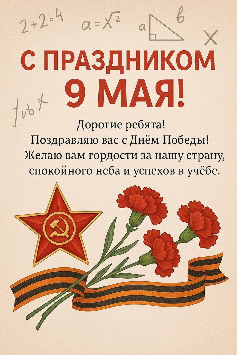 Дорогие мои ученики и их замечательные семьи! С Днём Победы! Пусть в вашей жизни всегда будет мир, стабильность и вера в лучшее. Пусть в задачах — только верные решения, а в жизни — только правильные пути. 9 мая — напоминание о том, как важна сила духа, мужество и единство. Берегите то, за что боролись наши деды, и помните: настоящая победа — это доброта, знания и любовь. С уважением, ваша Алёна Валерьевна ❤️