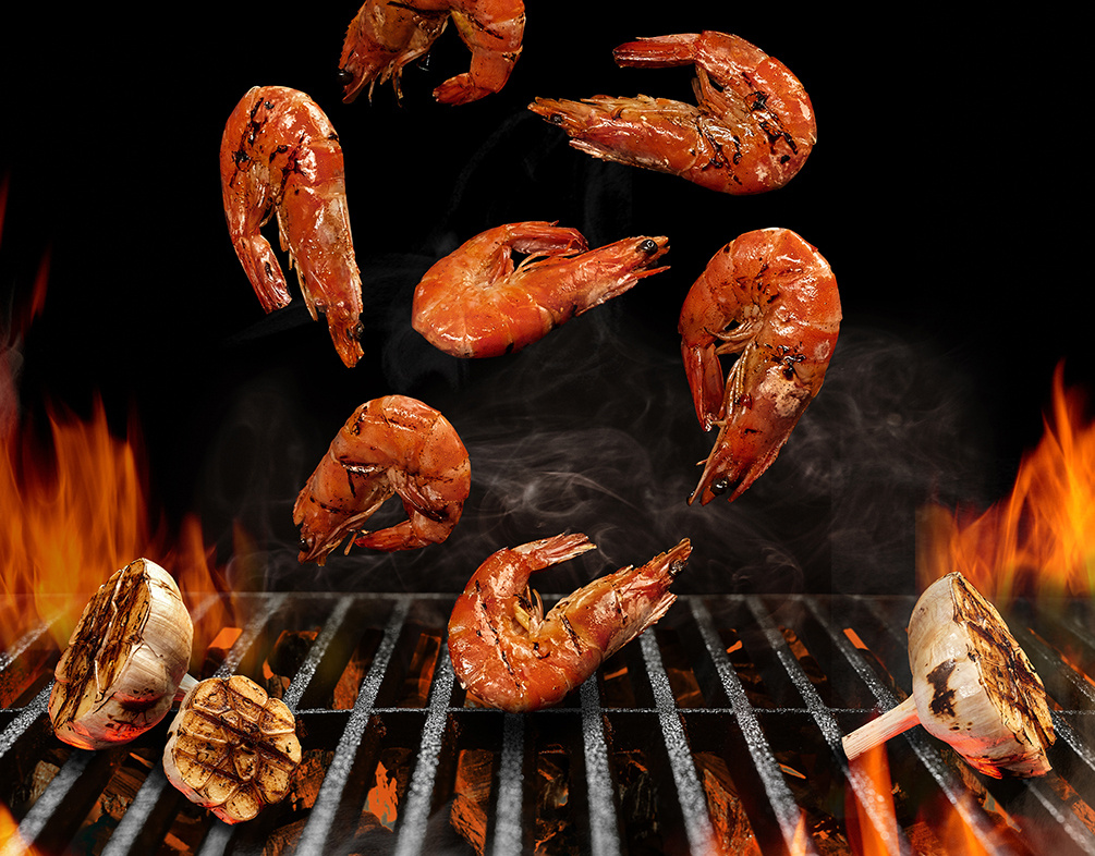Креветки для гриля лучше брать покрупнее, обязательно в панцире и с головой. Уже очищенные креветки можно легко пересушить. Ни в коем случае не размораживайте креветки под струёй воды. Лучше всего положить их в холодильник на ночь. При такой разморозке креветки останутся сочными. За час до жарки креветки хорошо замариновать: на полкило креветок понадобится 30 мл оливкового масла, 50 мл белого вина, 10 зубчиков чеснока, тимьян и базилик. Затем жарьте креветки на хорошо раскаленном гриле. Переворачивать их не нужно. Чтобы придать креветкам пикантный вкус, добавьте в процессе приготовления специи (чеснок, перец, имбирь), сделайте соус или воспользуйтесь готовым, например соевым. Хорошее дополнение к креветкам — листья салата, помидоры, оливки. Готовые креветки можно нанизать на шпажки, чередуя с другими продуктами — курицей, овощами. Кальмаров для барбекю выбирайте небольших (мини-кальмары по 5–7 см в длину). Как правило, они продаются уже очищенными. Только не забудьте снять с кальмаров