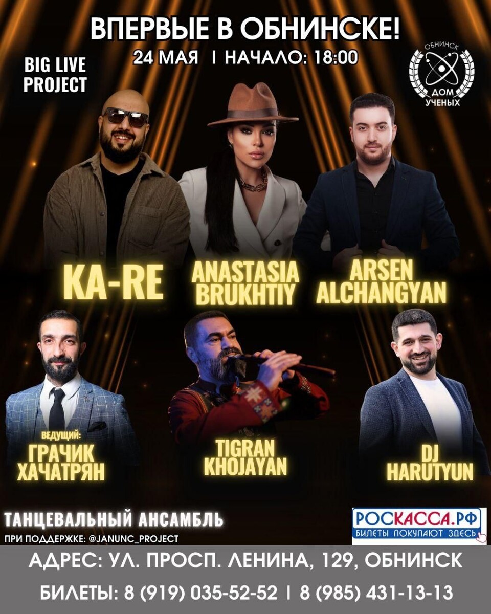 🎶24 мая в 18:00 в Доме учёных концерт «Big Love Project». Исполнители: Ka-Re, Анастасия Брухтий, Арсен Алчангян, диджей Арутюн. Ведущий вечера — Грачик Хачатрян. Незабываемая атмосфера, море позитива и любимые хиты! Длительность мероприятия — 3 часа 30 минут. 🎟Купить билеты - https://du-obninsk.ru/afisha/big-live-project-vpervye-v-obninske Обнинск, пр-т Ленина, 129. 👍 Подписаться | Прислать мероприятие