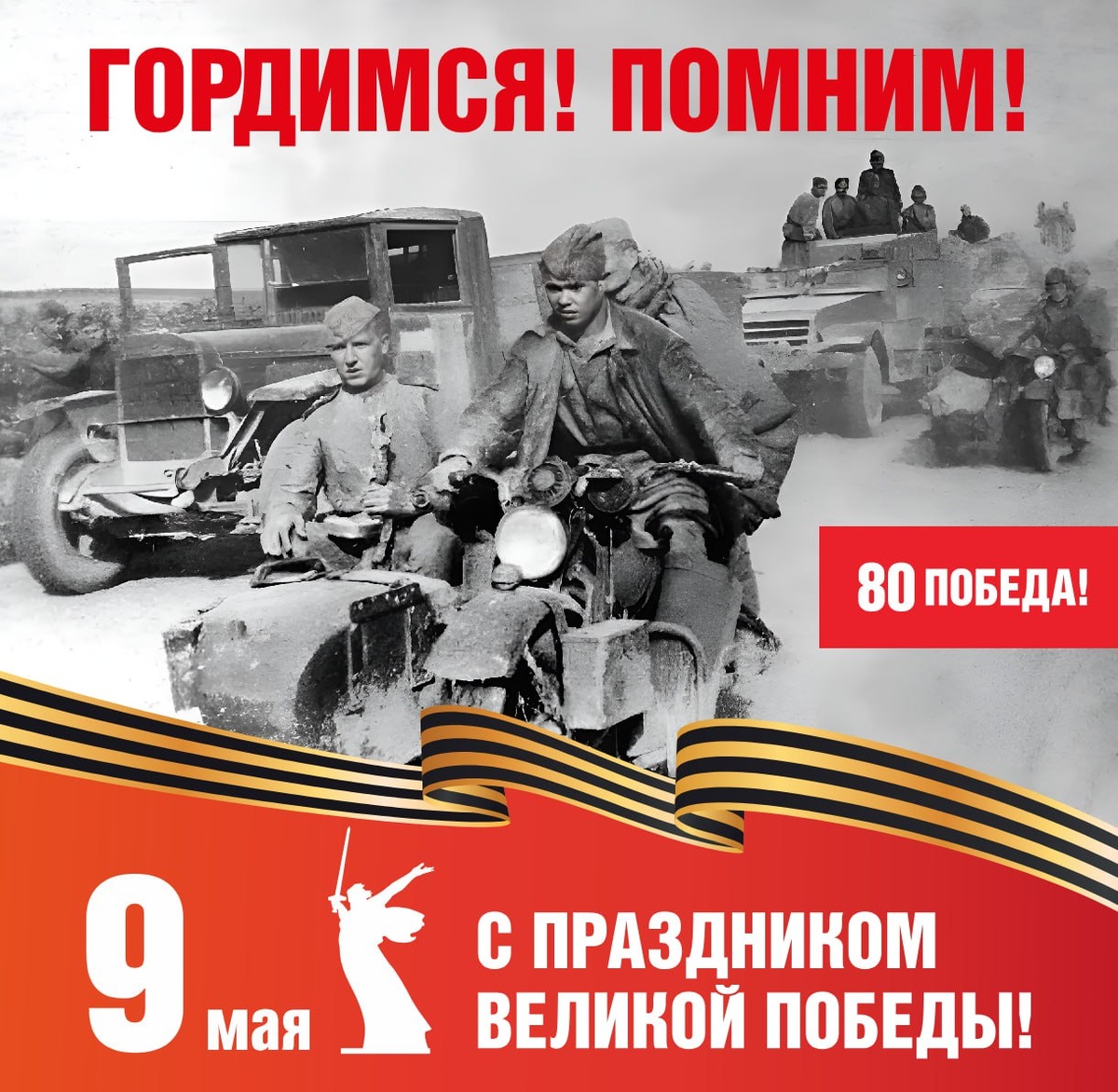 Искренне поздравляем вас с великим праздником — Днем Победы! Эта священная дата вновь заставляет вспомнить о невероятной отваге, силе духа и доблести наших предков. Мы чтим заслуги тех, кто шел в бой, самоотверженно работал в глубоком тылу, переживал тяготы ради счастья будущих поколений. Низкий поклон и вечная слава героям, отстоявшим свободу Отечества, жертвуя собой! Пусть День Победы соединяет сердца миллионов россиян, наполняя наши души чувством патриотизма и верностью Родине. Мирного неба над головой каждого гражданина нашей великой страны!