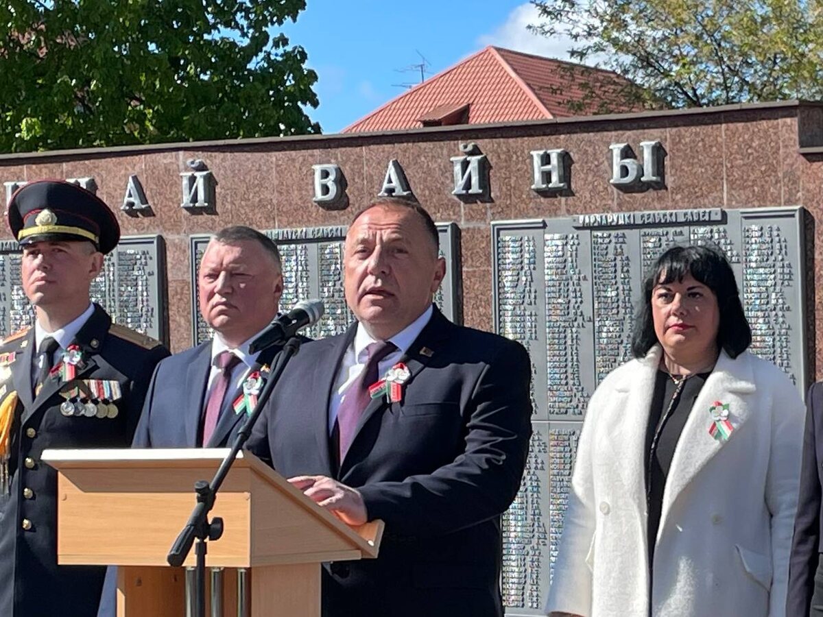 Председатель райисполкома Сергей Бартош поздравил шкловчан и гостей города с Днем Победы и рассказал о невосполнимых утратах, подвиге героев: – Война перечеркнула жизни и судьбы каждого третьего жителя республики, оставив после себя горе и разрушения. Как и Хатынь, ставшая символом народной трагедии, 18 деревень Шкловского района разделили страшную участь – их сожгли дотла. За годы войны оккупанты уничтожили почти 9 тысяч мирных жителей. Более 6,5 тысяч уроженцев этих земель пали в боях на фронте и в партизанских отрядах, а около 3 тысяч человек были насильно вывезены в фашистское рабство. Шкловская земля воспитала настоящих героев, чьи имена навсегда вписаны в летопись Великой Победы: Геннадий Иосифович Величко, Николай Александрович Корначёнок, Андрей Степанович Милютин, Иван Фирсович Нестеров, Валентин Викторович Пилипас. Все эти люди удостоены звания Героя Советского Союза. Их мужество – наша гордость, их подвиг – наш нравственный ориентир. Глава района дал напутствие молодому по