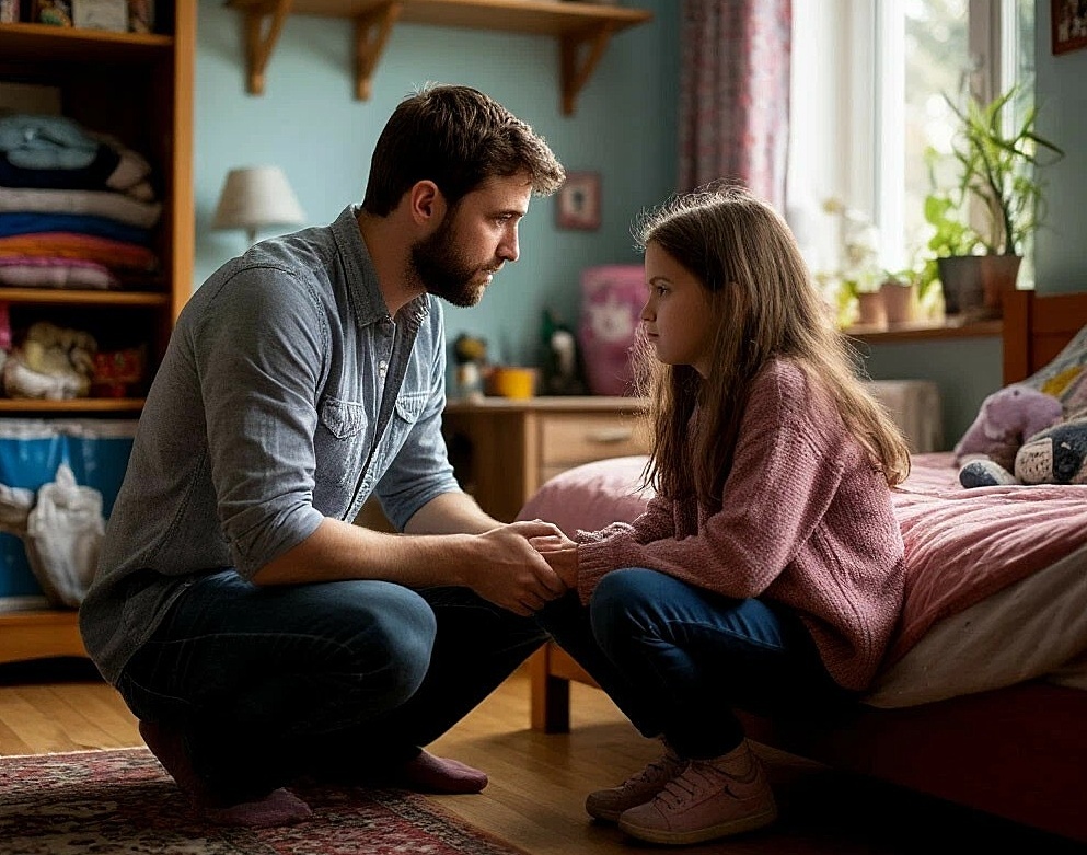 — Хватит, — оборвал её Михаил. Он подошёл к дочери и присел рядом, заглянув ей в глаза. — Давно это происходит, малыш?