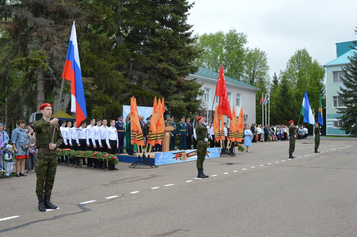 11 часов утра. Под музыку композитора Александрова «Священная война» на главную площадь района вносят Государственный флаг Российской Федерации, легендарное Знамя Победы, флаг Республики Башкортстан и флаг Ермекеевского района!