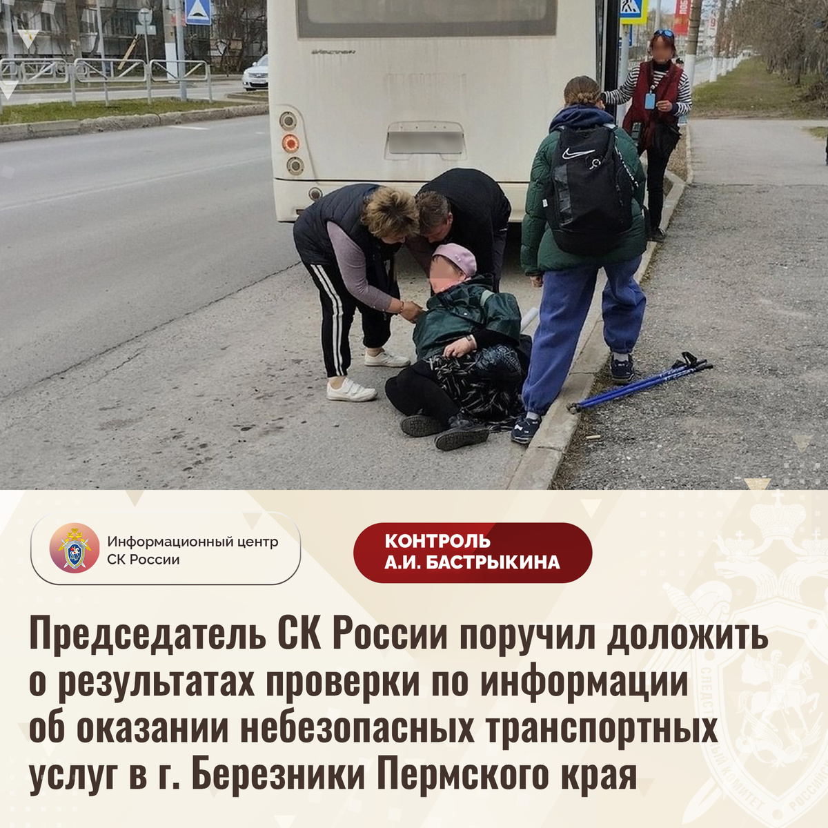 Председатель СК России поручил доложить о результатах проверки по информации об оказании небезопасных транспортных услуг в г. Березники Пермского края В социальной сети сообщается, что 7 мая текущего года в городе Березники Пермского края водитель автобуса, не убедившись в завершении посадки и высадки пассажиров, начал движение от остановочного пункта, в результате чего пожилая пассажирка упала на проезжую часть, ударившись рукой. В СУ СК России по Пермскому краю по данному факту организована процессуальная проверка. Председатель Следственного комитета Российской Федерации Александр Иванович Бастрыкин поручил руководителю СУ СК России по Пермскому краю Денису Валерьевичу Головкину доложить о промежуточных результатах процессуальной проверки и о принятом по итогам решении. Исполнение поручения, а также ход процессуальной проверки поставлены на контроль в центральном аппарате ведомства. #СледственныйКомитет #СКРоссии #СКР #ИЦСКР #ИнформационныйЦентр #АлександрБастрыкин #ПредседательСКР #