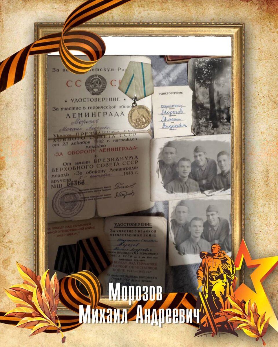 Морозов Михаил Андреевич Звание: Старший сержант 🎖️Медаль «За победу над Германией в Великой Отечественной войне 1941–1945 гг.» 🎖️Медаль «За оборону Ленинграда» 🎖️Медаль «За отвагу» В годы войны он перевозил продукцию и снаряды по Ладаге. Однажды, во время перевозки, случился взрыв снаряда на пантоне, и его волной выбросило, но его спасли и машину вытащили. После этого Михаила госпитализировали на Большую Землю из-за сильного истощения. Участие в боевых действиях в Кёнисберге, где он был водителем, стало одним из важных моментов его фронтовой жизни — именно там он встретил Победу. Его стойкость и героизм навсегда останутся в нашей памяти.