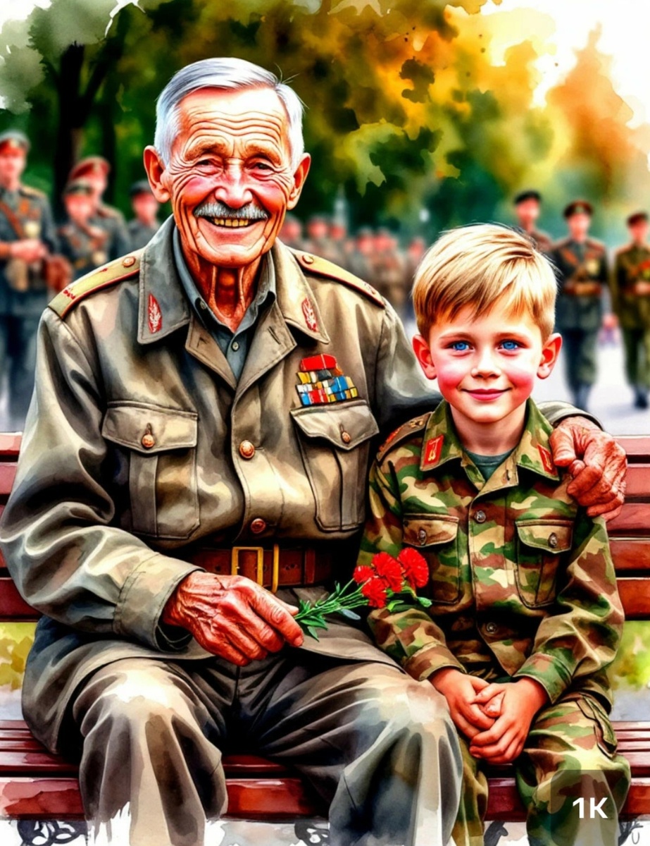 Дорогие друзья! Поздравляю с 9 Мая — Днем Великой Победы! Желаю вам мирного неба над головой и вечной благодарности за тот весомый вклад, что внесли наши деды в Великую Победу! Пусть память о героях Великой Отечественной войны вечно живет в наших сердцах. Москва, Красная площадь, 9 мая. Теплый майский ветер трепал алые знамена и флаги над огромной площадью, наполненной праздничной суетой. Шум толпы смешивался с торжественными звуками военного оркестра, разносившимися от кремлевских стен. Семилетний Паша крепко держался за руку своего дедушки Виктора Ивановича, ветерана Великой Отечественной войны. Дед был высоким мужчиной крепкого телосложения, хотя годы оставили следы усталости на его лице. Но сегодня, несмотря на возраст, глаза его сияли гордостью и радостью — он снова шел вместе с народом отмечать День Победы. — Деда, расскажи ещё раз, почему мы празднуем этот день? Виктор Иванович улыбнулся внуку, вспомнив свою молодость, войну и тот самый миг, когда было объявлено о победе.