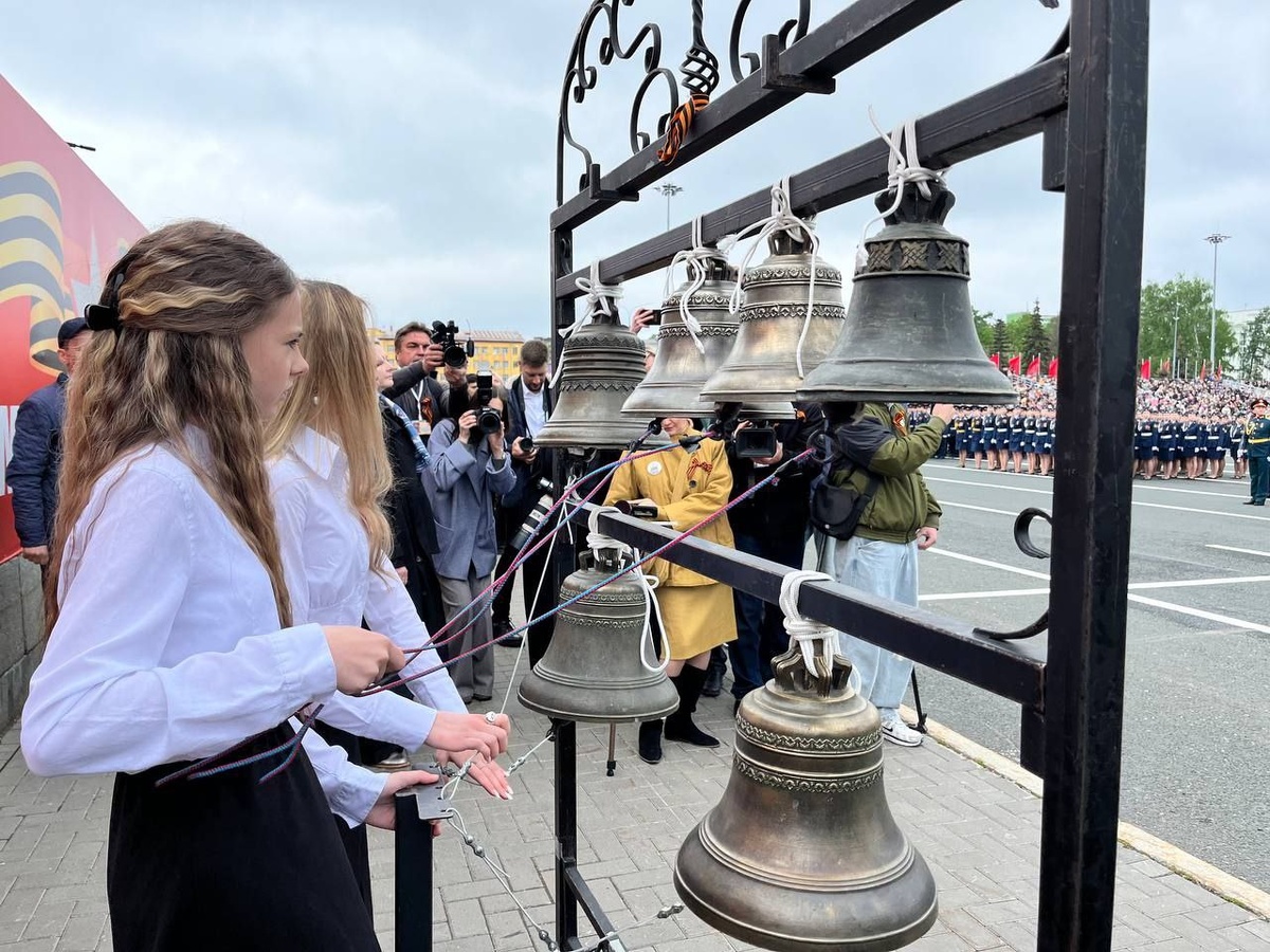 На площади вместе с военным оркестром звучали переливы колокольного звона. За переносной звонницей юные участницы образцового ансамбля «Самарские звонари» центра детского творчества «Младость» подразделения Кириллица Дарья Пряхина и Софья Зенюк. Видео и фото: Полина Маврина