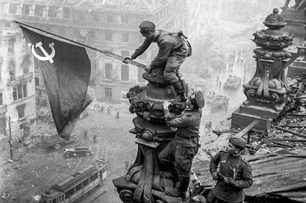 Халдей получил редакционное задание от ТАСС и прилетел из Москвы в Берлин 2 мая. На Рейхстаге уже было множество красных знамен, Евгений привез с собой три самодельных – первое он установил на крыше аэродрома Темпельхоф, второе – у колесницы на Бранденбургских воротах, а третье – на крыше Рейхстага.