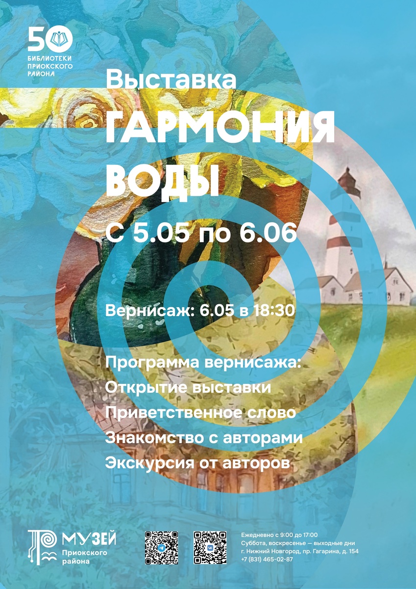 Музей приокского района Друзья, у нас открывается новая большая выставка «Гармония воды» — это уникальная коллекция работ талантливых нижегородских акварелистов, которые через призму акварельной живописи передают красоту и многообразие окружающего мира.