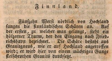 Финский архипелаг начинается в пятнадцати верстах к северу от Нагорья (Hochland). На первом из них стоит деревянная башня, обозначающая вход в Фридрихсгам (Friedrichshavn). Архипелаг, как и нагорье, состоит из гранитного гнейса; здесь он перемежается с толстой жилой гранита телесно-красного цвета.