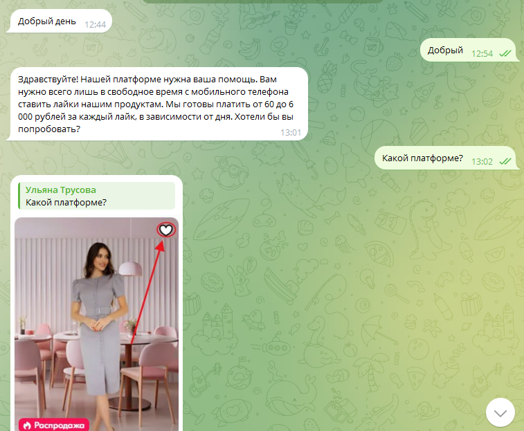 В телеграме мне написала девушка под ником Anna Ashmarova, причём её инициалы и фото явно ей не принадлежат. Сказала, что какой-то "нашей" платформе нужна помощь. Мне всё сразу стало понятно. Обещание лёгких денег - "вам всего-то лишь нужно", лёгкая, непринуждённая работа - "в свободное время с телефона просто ставьте лайки", хорошие деньги почти за даром - "платим от 60 до 6000 рублей за лайк". Интересно, какой идиот готов платить 6к за какой-то лайк? Вопрос риторический, потому что ясно - никто тут не собирается платить ни рубля. Перед нами самый обыкновенный мошенник. Вот только что ему от меня надо? Я продолжаю с ней разговор, мне не терпится это выяснить. Когда же речь дойдёт до банковских данных или ссылок? На все конкретные вопросы мой собеседник отвечает шаблонными фразами. Кстати, да, разговаривает со мной бот. А вот и оно! После того, как я сказала, что лайки проставлены, мне пообещали выслать ссылку. Думаю, не нужно объяснять, что мошенники высылают ссылки для перехода, ч