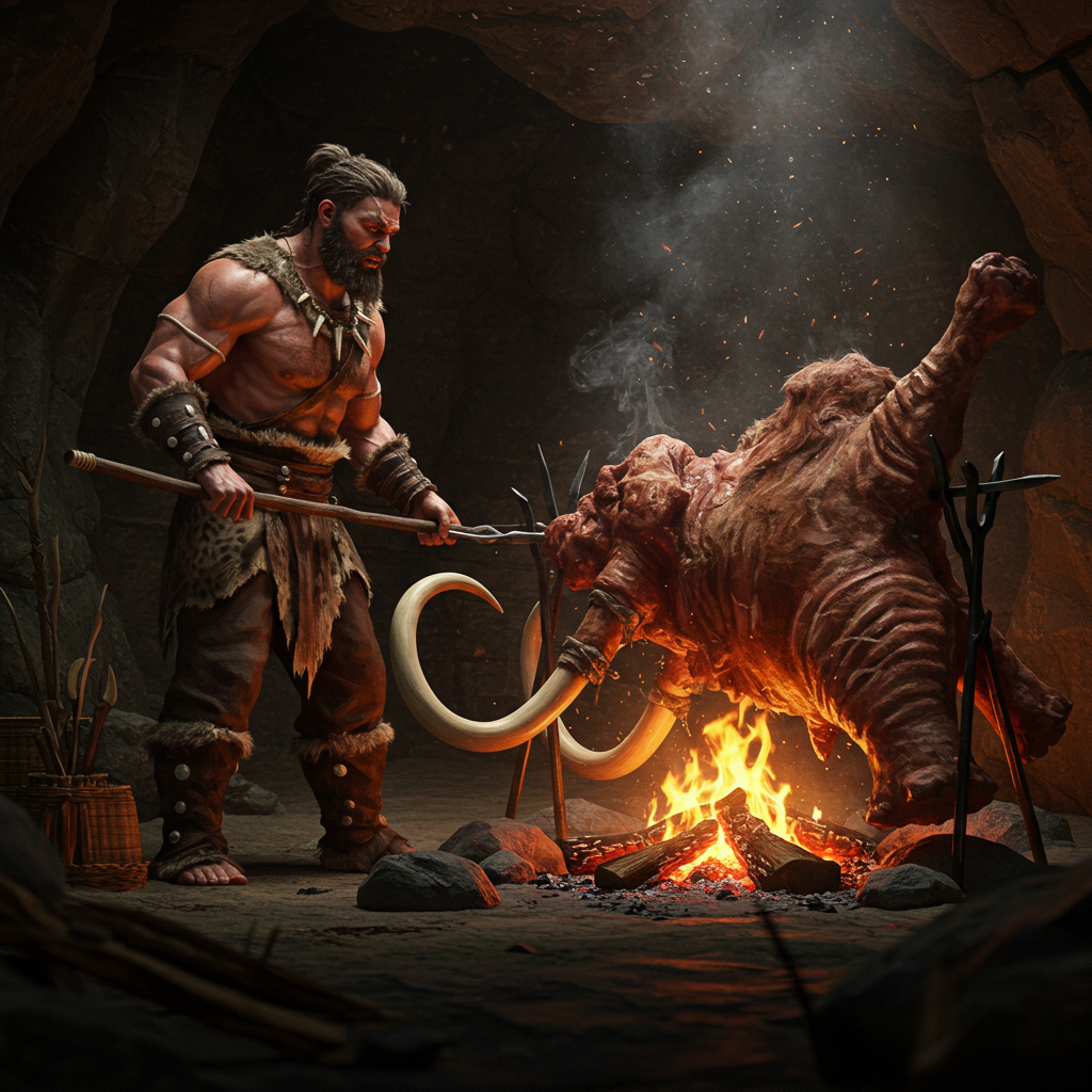 Представьте себе не просто первобытного человека, а вершину его физического и ментального развития в условиях дикой природы – пещерного супермена. Он не тратил время на сбор кореньев или пережевывание травы - слишком много времени тратилось бы на низкоэнергетическую пищу, которая быстро бы кончилась. В отличии от тушки мамонта!