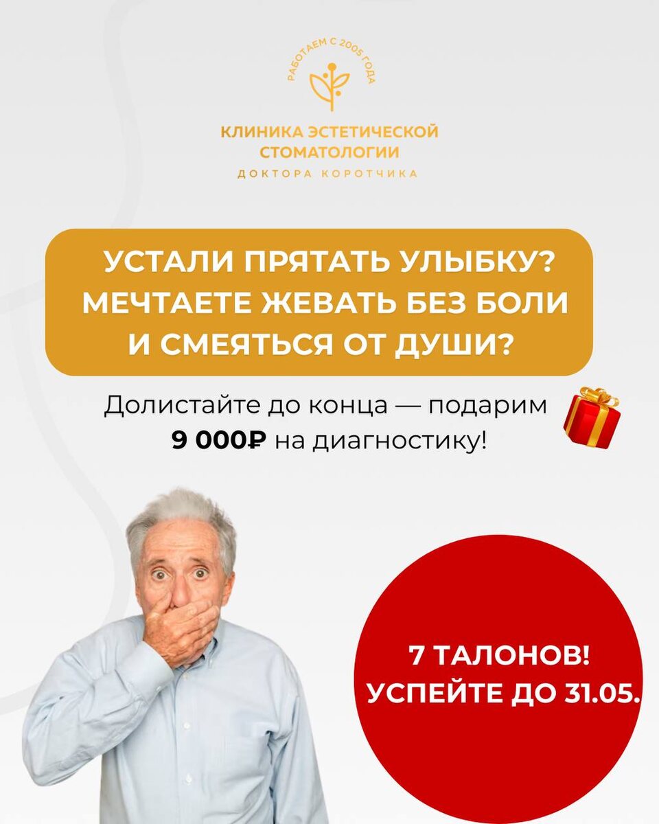 Устали прятать улыбку? Мечтаете жевать без боли и смеяться от души? В клинике доктора https://vk.com/doctor_korotchik_dubna Коротчика ваше решение начинается с точной диагностики – наш подарок! 🎁 Она гарантирует успешную имплантацию, идеальное приживление импланта, безопасность и комфорт благодаря точному цифровому планированию. ✅ Более 20 000 довольных пациентов; ✅ Более 5 000 установленных имплантов; ✅ Более 98% успешных случаев. Даже сложные случаи — наша специализация! 🔥 Имплантация Dentium (Южная Корея) — надёжное качество по доступной цене! Только в мае — от 35 000 ₽! ⚡️ Премиальные решения для любых случаев: 🔥 Straumann (Швейцария) — эталон эстетики и долговечности; 🔥 NeoDent (Бразилия) — идеальный баланс цены и качества. Подарок 🎁 на 9 000 ₽ для первых шагов к безупречной улыбке! По промокоду «ИМПЛАНТАЦИЯ» до 31 мая вы получаете: 💫 Первичный приём (стоимостью 2 500 ₽); 💫 Комплексную диагностику с использованием искусственного интеллекта (стоимостью 6 500 ₽); 🎁 2