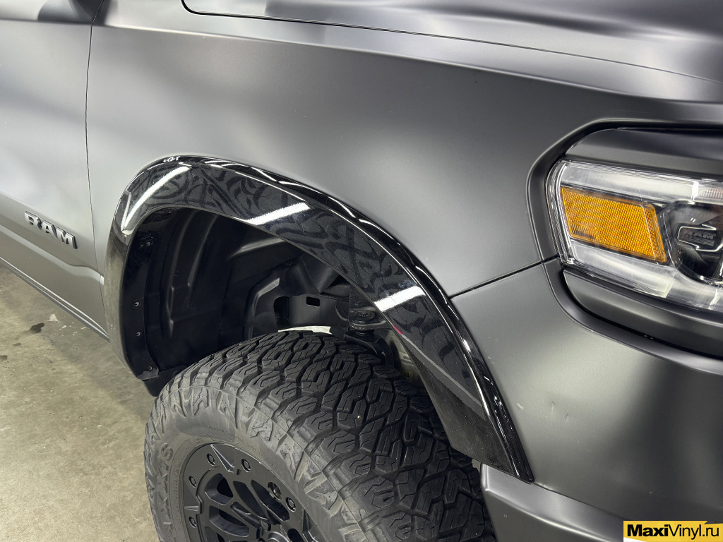 Этот RAM 1500 уже не первый раз у нас в гостях, ранее мы полностью оклеивали его прозрачным матовым полиуретаном и сейчас владелец решил навести немного лоска. Автомобиль не стоял на месте, в основном эксплуатировался в условиях бездорожья - как и положено настоящему джипу, а это значит постоянный пескоструй, камни и грязь, которые со временем портят внешний вид авто. Полиуретан, который мы наносили более года назад, в некоторых местах износился и требует обновления. Снимаем его и анализируем состояние кузова. Низ дверей и задних крыльев – жертвы пескоструя. Пленка в этих местах выглядит пугающе: так много повреждений, будто это цель из тира. Но после ее демонтажа кузов выглядит идеально! Это именно тот результат, который мы и ждем от защитной пленки. Все повреждения, которые берет на себя полиуретановая пленка – лучший показатель того, зачем вообще оклеивать кузов. Пленка принимает на себя всё негативное воздействие и сохраняет лакокрасочное покрытие. На данном авто в лобовое стекло п