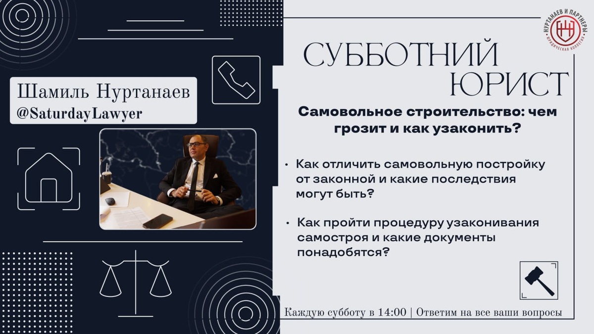 ⚡️⚡️⚡️⚡️Самовольное строительство: чем грозит и как узаконить? Об этом и о многих других вопросах мы поговорим завтра 10 мая на очередной трансляции "Субботнего Юриста" ⚖️ Эфир проведет юрист с более, чем 20 летней практикой – Шамиль Нуртанаев (нажав на имя вы можете узнать о юристе больше). 📝 Вот основные вопросы, которые мы обсудим в эфире: 1. Как отличить самовольную постройку от законной и какие последствия могут быть? 2. Как пройти процедуру узаконивания самостроя и какие документы понадобятся? Также, каждый может задать свой вопрос любым удобным для вас способом, перейдя по ссылке: https://clck.ru/3ByDxh Или же просто напишите вопрос в комментариях к посту Получите юридическую консультацию, не выходя из дома! 🎥 Записи эфиров на нашем Rutube: https://rutube.ru/channel/40148985/ VK Видео: https://vk.com/video/@vk.nurtanaev Дзен: https://clck.ru/3DQGpA ✅ Присоединяйтесь к эфиру 10 мая 2025 года в 14:00, будет интересно: https://t.me/SaturdayLawyer