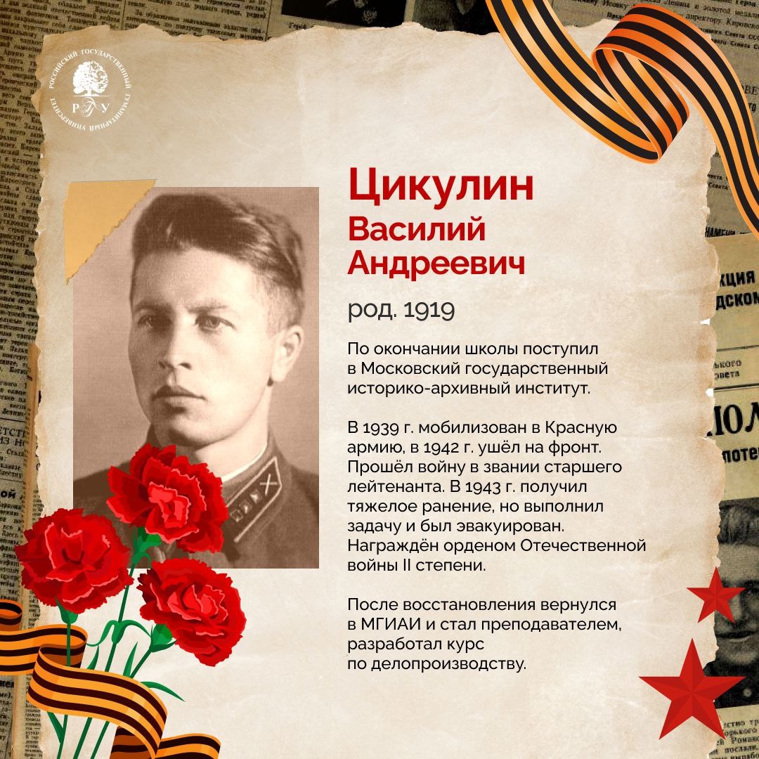 Мы помним! 👥 В преддверии Дня Победы мы продолжаем делиться историями студентов и преподавателей Московского государственного историко-архивного института (ныне ИАИ РГГУ), воевавших в Великой Отечественной войне. 🗣️ Цикулин Василий Андреевич (род. 1919) По окончании школы поступил в Московский государственный историко-архивный институт. В 1939 г. мобилизован в Красную армию, в 1942 г. ушёл на фронт. Прошёл войну в звании старшего лейтенанта. В 1943 г. получил тяжелое ранение, но выполнил задачу и был эвакуирован. Награждён орденом Отечественной войны II степени. После восстановления вернулся в МГИАИ и стал преподавателем, разработал курс по делопроизводству. 🗣️ Черноморский Моисей Наумович (род. 1913) Окончив истфак Ленинградского университета, работал в архиве Октябрьской революции. В июле 1941 г. вступил в дивизию народного ополчения. В ноябре 1941 г. участвовал в бою у станции Лигово, был тяжело ранен в обе ноги, за героизм удостоен медали «За отвагу». Из-за ранения ампутирова