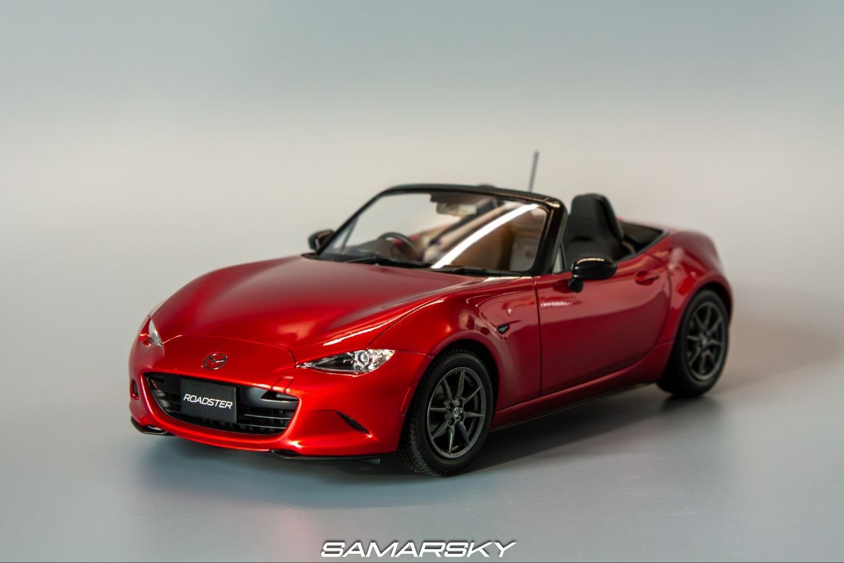 Mazda Roadster ND 2015 Tamiya 24342 '15 1/24 Одна из самых крутых и узнаваемых моделей Мазда, легендарный Roadster поколения ND. Идеальная развесовка, задний привод, механика, многорычажная подвеска и малый вес. Цвет кузова 41V Mazda Soul Red. Набор просто превосходен, с отличной детализацией, правильной геометрией, очень красивой оптикой. Из доработок - экраны теплозащиты на днище из обычной фольги, но полностью повторяющие оригинальные. Первый раз использовал флок для имитации коврового покрытия в салоне. В наборе еще идет фигурка девушки за рулем, но в рамках ГБ фигурки запрещены. Основной цвет - двухслойная краска от Hobby Link. Остальные краски Tamiya и Gunze на спиртовой основе, лак Gunze H30, смывка Gunze, клей Revell, сверхтекучая Tamiya и Tamiya Craft Bond. Автор: Михаил Самарский. ================================