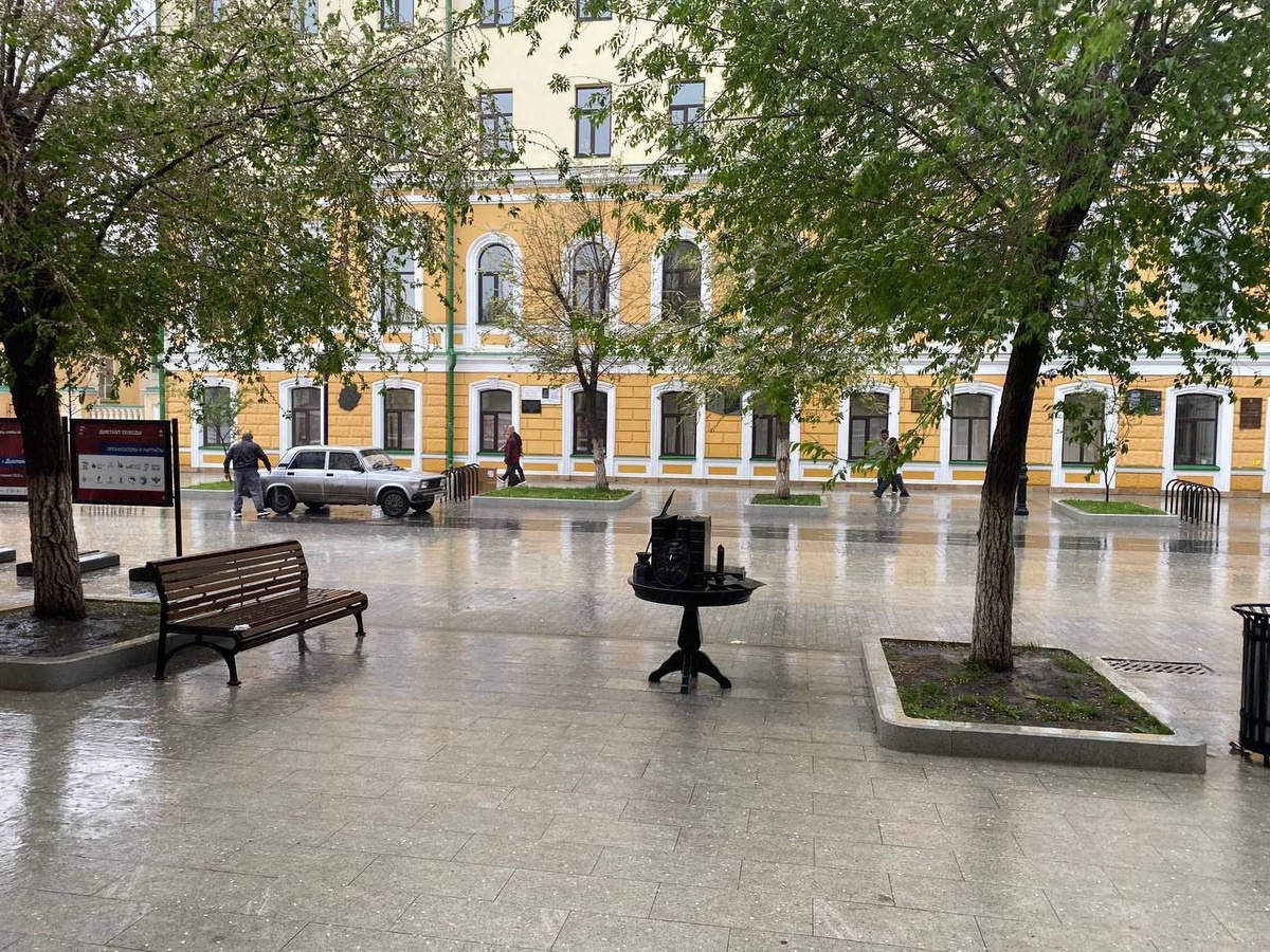 Улица Советская опустела из-за ливня и грозы. Оренбуржцы вынуждены прятаться под навесы зданий и в заведения общепита.