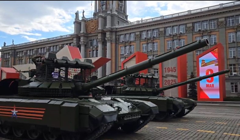 📷❗️На параде Победы в Екатеринбурге на широкое обозрение публики были представлены: — ОБТ Т-72Б3М обр. 2024, оснащённые "стоковыми" протикокумлятивно-противодронными "козырьками" с размещёнными на них антенными модулями РЭБ и бортовыми комплектами ДЗ на базе элементов 4С24; — ОБТ Т-90М также с дополнительными противодронными "козырьками" верхней проекции; — самоходные пусковые установки 9А83М4 зенитно-ракетной системы сверхбольшой дальности С-300В4 с 4 ТПК для зенитных ракет 9М83МД с дальностью действия порядка 150 - 170 км; — модернизированная САУ "Мста-СМ2" с автоматизированной системой управления наведением и огнём; — БМП-3М с противодронными "козырьками" и маскировочным комплектом, снижающим ЭОП и инфракрасную сигнатуру машин. О появлении данной техники сооющает издение "Бизнес Журнал. Урал". https://dzen.ru/id/6425916a1950720421f18802