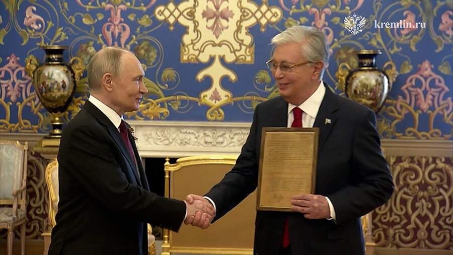 Президент РФ Владимир Путин 9 мая передал лидеру Казахстана Касым-Жомарту Токаеву наградной лист на присвоение его отцу звания Героя Советского Союза. «Уважаемый Касым-Жомарт Кемелевич, хочу передать вам наградной лист, это документ, который засвидетельствовал награждение вашего отца орденом Героя Советского Союза», — обратился Путин к Токаеву. Министерство обороны России 6 мая раскрыло документы с информацией о подвиге, совершенном гвардии сержантом Кемелем Токаевым, отцом президента Казахстана в годы Великой Отечественной войны (ВОВ). Согласно документам, Токаев сначала выполнял задачу по защите российских танков, а затем, вместе с товарищами, перешел в наступление. Он одним из первых прорвался на позиции противника, уничтожив пять немецких солдат и взяв в плен еще одного. В ходе наступления Токаев был ранен в ногу, после чего его госпитализировали и комиссовали в июне 1954 года. Президент РФ также отметил, что День Победы является праздником практически каждой семьи, «каждой семьи н