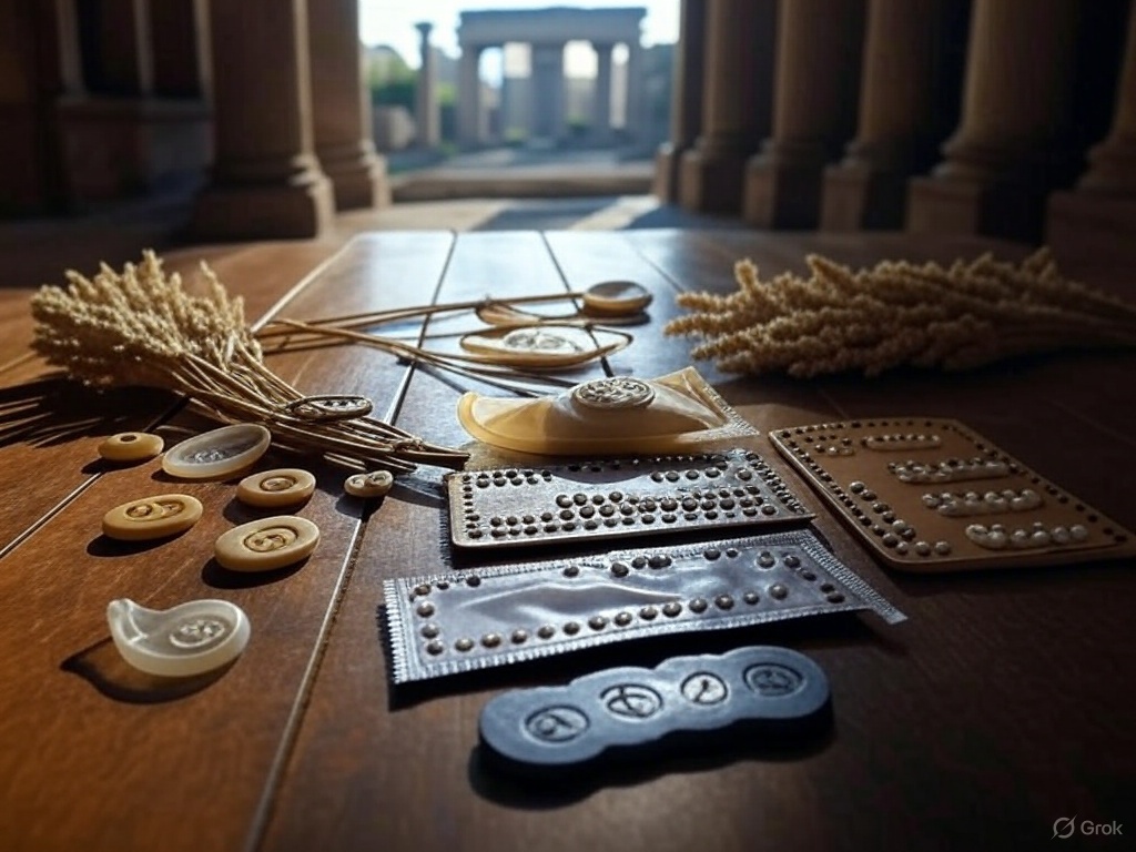 - Презервативы из животных тканей Существуют предположения, что римляне могли использовать мочевые пузыри или кишечники животных в качестве барьерных средств. Такие изделия упоминаются в контексте защиты от венерических заболеваний, но их использование для контрацепции остаётся предметом споров среди историков. Например, в текстах римского сатирика Ювенала есть намёки на использование подобных средств элитой для предотвращения нежелательной беременности у любовниц.