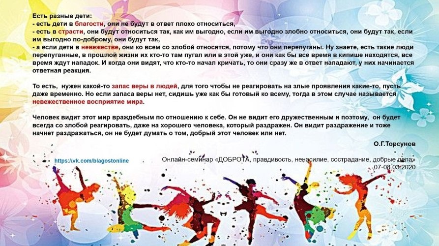 ДЛЯ ЧЕГО НУЖЕН ЗАПАС ВЕРЫ В ЛЮДЕЙ Есть разные дети: ♻ есть дети в благости, они не будут в ответ плохо относиться, ♻ есть в страсти, они будут относиться так, как им выгодно, если им выгодно злобно относиться, они будут так, если им выгодно по-доброму, они будут так, ♻ а если дети в невежестве, они ко всем со злобой относятся, потому что они перепуганы. Ну знаете, есть такие люди перепуганные, в прошлой жизни их кто-то там пугал или в этой уже, и они как бы все время в кипише находятся, все время ждут нападок. И когда они видят, что кто-то начал кричать, то они сразу же в ответ нападают, у них начинается ответная реакция.