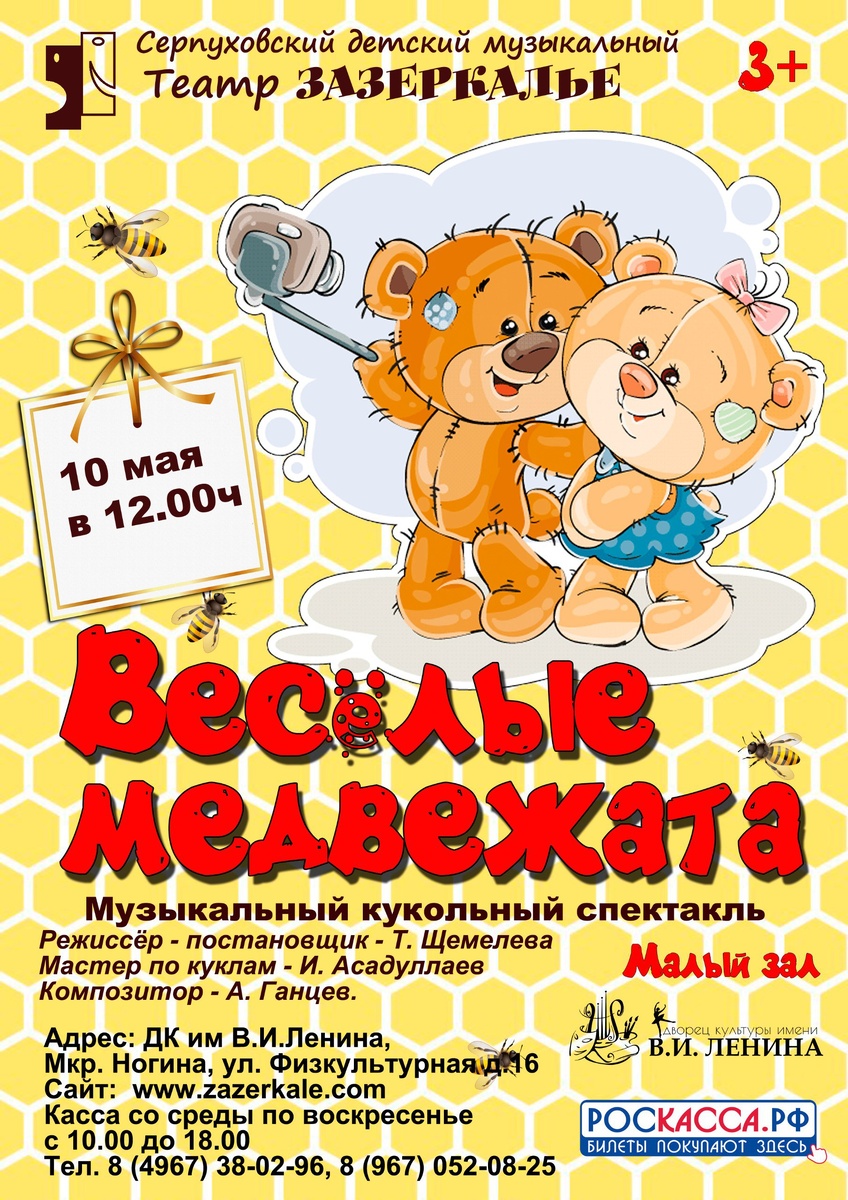✨ Кукольный спектакль «Весёлые медвежата» Музыкальный кукольный спектакль «Весёлые медвежата» прекрасно подойдет для семейного просмотра!👍 Это забавная история о приключениях двух медвежат во время каникул никого не оставит равнодушным! 🚫 Возраст: 3+ 📆 10.05.2025 🕒 12:00 🏢 Серпуховский детский музыкальный театр "Зазеркалье" 📍 г. Серпухов, мкр-н Ногина, ул. Физкультурная, 16 в ДК им. В. И. Ленина 💰 Цена от: 500 до 600 ₽ 🎫 Купить билет: https://zazerkale.com/ ✅ Мероприятия Серпухов https://dzen.ru/id/66f01c6eb4c6fe60c9ca1608 http://vk.com/serpukhov_events http://dzen.ru/serpukhov_events