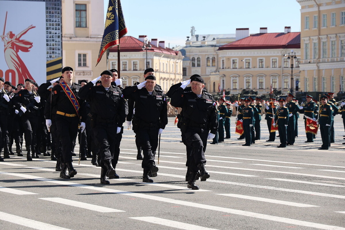 В торжественном марше по Дворцовой площади прошел парадный расчет из 120 сотрудников Специального полка полиции ГУ МВД России по г. Санкт-Петербургу и Ленинградской области. Именно сотрудники данного подразделения ежедневно несут службу по охране общественного порядка на улицах города, оказывают силовую поддержку при задержании опасных преступников и при первой необходимости выезжают в горячие точки. Все участвующие в параде полицейские принимали участие в СВО. Возглавил парадный расчет начальник Управления организации охраны общественного порядка и взаимодействия с органами исполнительной власти полковник полиции Денисеня Сергей Иванович, удостоенный медали ордена «За заслуги перед Отечеством II степени». Ранее мы рассказывали, что в Петербурге увековечили память полицейских, погибших в зоне СВО.
