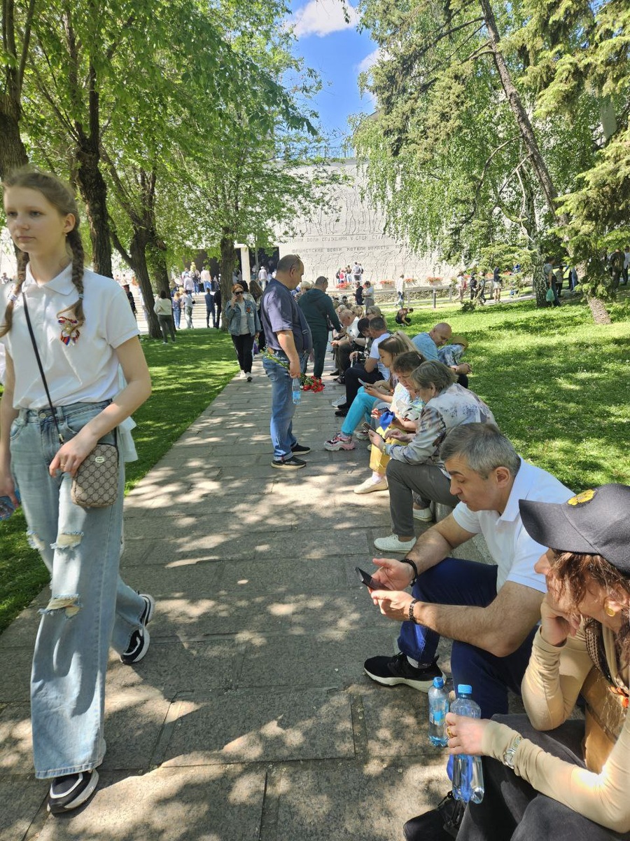 Жарко, многие сидят на бетонных парапетах, некоторые на газонах.