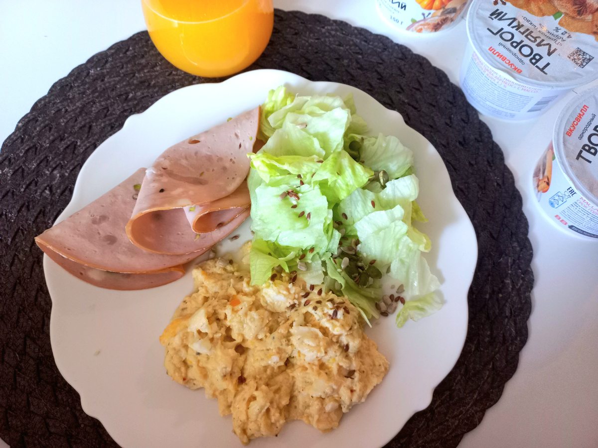 Обычно к скремблу у нас салат и колбаска с фисташками и без всяких химикатов: мортаделла