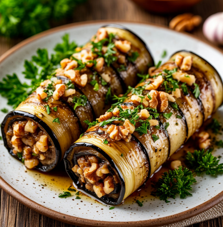 Приготовим аппетитные рулетики из баклажанов с начинкой из грецких орехов – изысканная закуска, которая станет украшением любого стола! Два баклажана моем, обрезаем хвостики и нарезаем вдоль тонкими слайсами. Слайсы баклажанов выкладываем на доску, присыпаем солью и оставляем на 20 минут, чтобы вышла горечь. Пока баклажаны “отдыхают”, займемся начинкой: половину стакана грецких орехов измельчаем в блендере или мелко рубим ножом. Один-два зубчика чеснока пропускаем через пресс или мелко нарезаем. Небольшой пучок укропа и небольшой пучок петрушки мелко рубим. Слайсы баклажанов промываем от соли и обсушиваем бумажным полотенцем. Разогреваем подсолнечное масло в сковороде. Обжариваем слайсы баклажанов с обеих сторон до золотистого цвета. Готовые слайсы выкладываем на бумажное полотенце, чтобы удалить лишнее масло. В миске смешиваем измельченные грецкие орехи, чеснок и зелень. Солим по вкусу. На край каждого слайса баклажана выкладываем небольшое количество начинки и сворачиваем в рулетик.