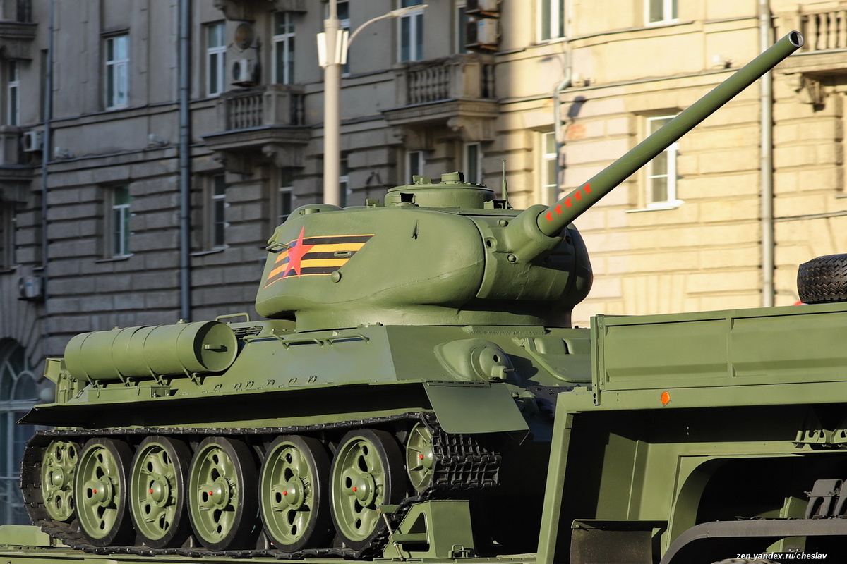 Открывала, парад, как обычно, историческая бронетехника: танки Т-34-85... ... и САУ СУ-100 Т-72Б3М Т-80БВМ Т-90М "Прорыв" БМП-1АМ "Басурманин"