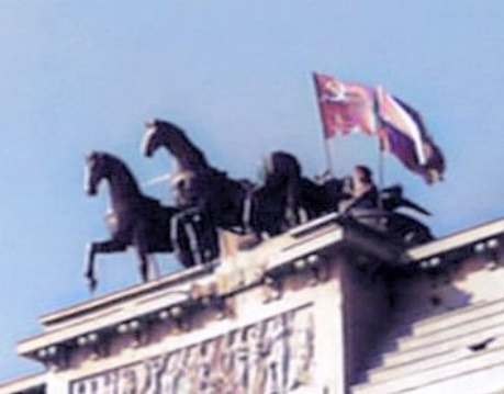 Берлин, бранденбургские ворота, май 1945, советский и польский флаги..