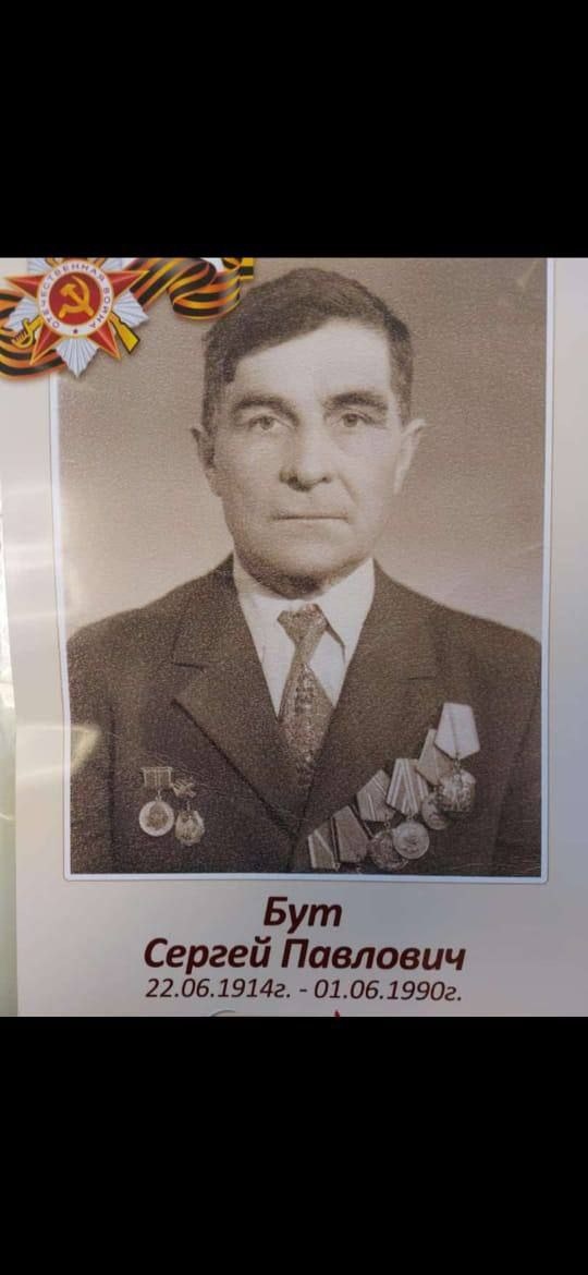 Бут Сергей Павлович, 22.06.1914–01.06.1990. Рядовой, водитель санитарной роты. Принял участие в военных действиях на Восточном фронте в борьбе с Японией. Награждён орденом Отечественной войны II степени, медалью «За Победу над Германией». Занимался эвакуацией раненых и погибших. О войне категорически не любил вспоминать, но когда внуки спрашивали – отвечал с юмором: «Мы давили япошек». Не любил вспоминать события военных лет - хотел уберечь семью от страшных подробностей