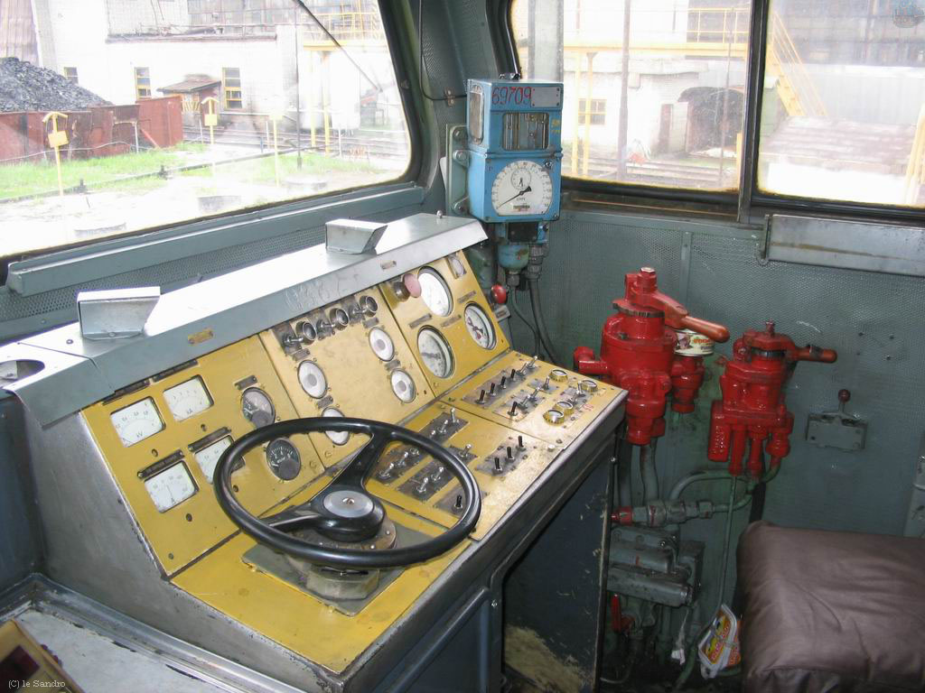 В кабине советского локомотива машинист и его помощник сидят перед панелью приборов, множеством тумблеров, кнопок и измерительных приборов. В центре или перед машинистом находятся основные рукоятки – контроллер и тормозные краны. Никакого рулевого колеса там нет.