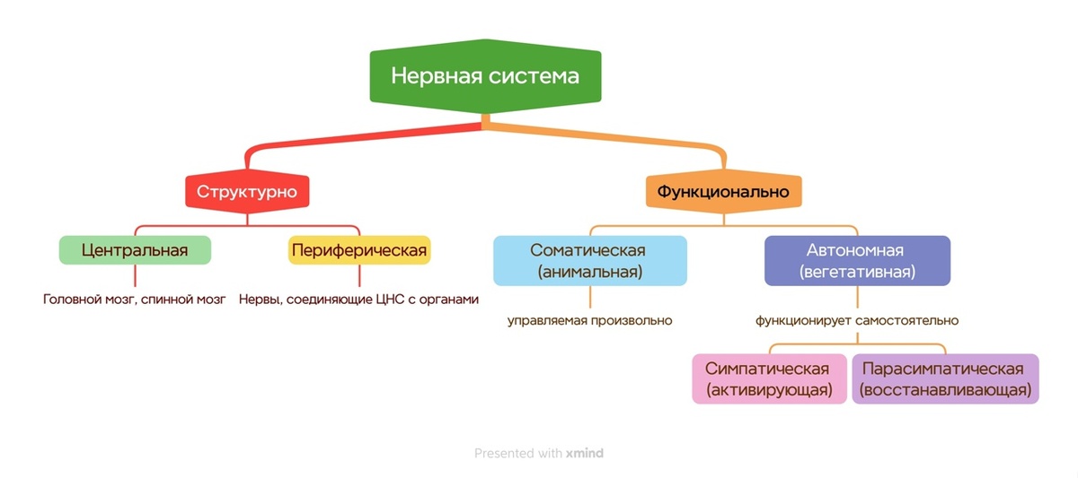 Анатомически (по строению) нервную систему подразделяют на центральную и периферическую. В состав центральной нервной системы входят головной и спинной мозг, в состав периферической — все нервные структуры, расположенные за их пределами. Структурной единицей нервной системы является нервная клетка — нейрон. Он состоит из тела с ядром (сомы) и отростков (аксонов и дендритов). Дендриты — это короткие отростки, благодаря им импульсы (информация, команды организма) подходят к нейрону. Аксоны — это длинные отростки, они отходят от клетки и передают импульс дальше — в другие клетки и органы. Аксон двигательного нейрона взрослого человека может достигать 1 (одного) метра в длину, а аксон чувствительного нейрона - до 1,5 (полутора) метров. Помимо нейронов, нервную ткань образуют клетки нейроглии. Они составляют 75% и формируют оболочку, обеспечивают опору и питание. Нервную систему функционально разделяют на соматический (анимальный) и автономный (вегетативный) отделы. Соматический отдел