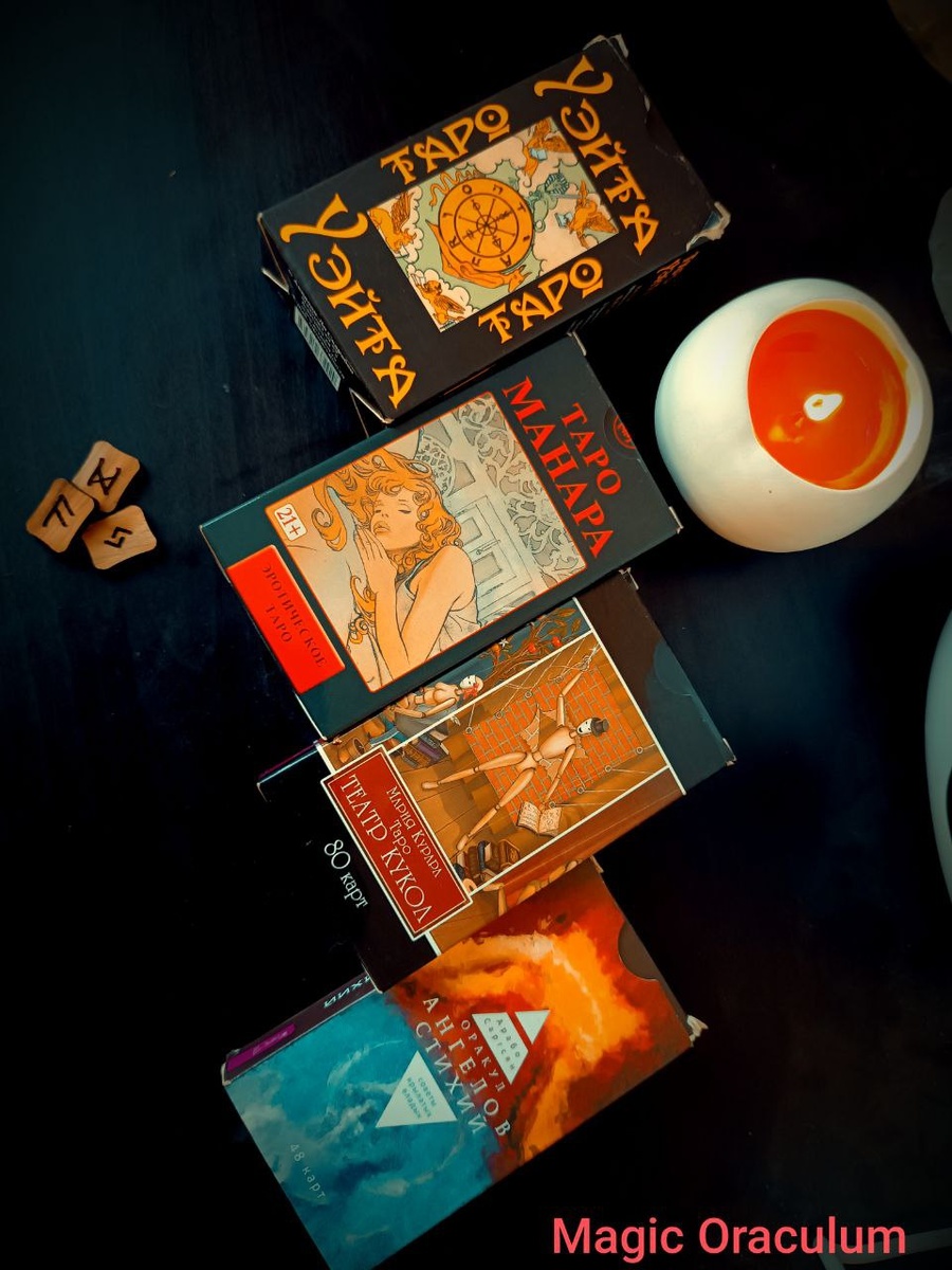 Напомним, что в настоящий момент мы работаем с различными колодами карт и рунами: 1. Классическая колода карт Артура Уэйта, самая знаменитая и универсальная колода на все случаи жизни☺️ 2. Таро Манара, чувственная, говорящая и яркая колода, идеальна для расклада на отношения, чувства и эмоциональный фон❤️ 3. Таро Театр Кукол, оригинальная, неповторимая колода, даёт возможность посмотреть на волнующую ситуацию со стороны. Увидеть театральность реальной жизни🎭 4. Оракул Ангелов Стихий, бесконечно глубокая колода с советами крылатых владык, которые дают нам подсказки и поддерживают в любой ситуации🪽 А также, расклады проводятся на рунах, любящих чёткость ответа и их правильность🖤