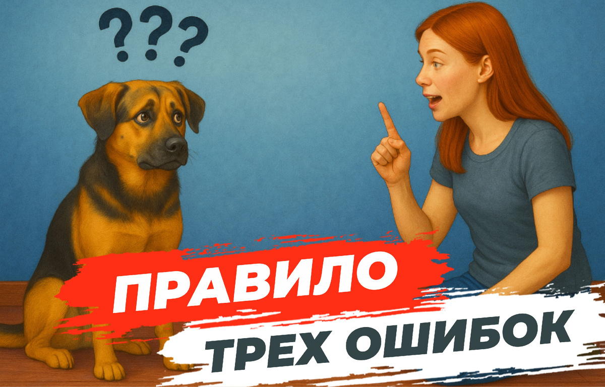 Правило трёх ошибок — это важный принцип в дрессировке собак: если собака совершает одну и ту же ошибку трижды подряд, это стоп-сигнал для тренера и повод пересмотреть подход к обучению. Три промаха - и собака сдалась. Учись вовремя остановиться и сохранить мотивацию.