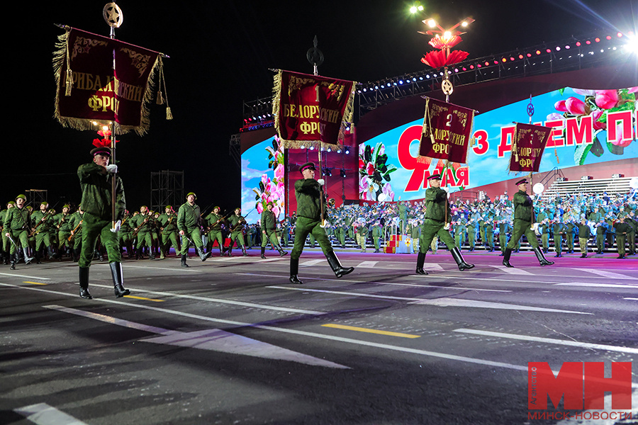 Военный парад и театрализованный эпизод «Будем жить» в ознаменование 80-й годовщины Победы советского народа в Великой Отечественной войне проходит у обелиска «Минск — город-герой» вечером 9 мая, сообщает корреспондент агентства «Минск-Новости». Президент Беларуси Александр Лукашенко принимает парад, особенность которого в этом году — увеличение исторической части в пеших расчетах и в механизированной колонне. Как анонсировали в Минобороны, зрители могут увидеть кавалеристов, тачанку с пулеметом, парадные расчеты офицеров с винтовками и с боевыми знаменами — реликвиями воинских частей, принимавших участие в Великой Отечественной войне, прохождение сводного парадного расчета инженеров с собаками, а также медработников и регулировщиков. Механизированную колонну возглавляют легендарные танки Т-34. В ней помимо современной техники есть мотоциклы, автомобили с прожектором и зенитными установками, а также «Катюша» — это неофициальное название бесствольных систем реактивной артиллерии периода