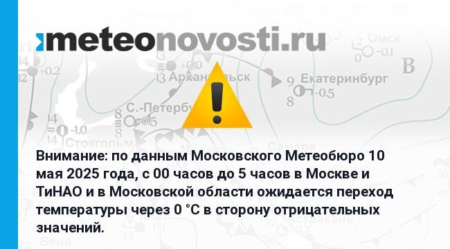 Внимание: по данным Московского Метеобюро 10 мая 2025 года, с 00 часов до 5 часов в Москве и ТиНАО и в Московской области ожидается переход температуры через 0 °C в сторону отрицательных значений.