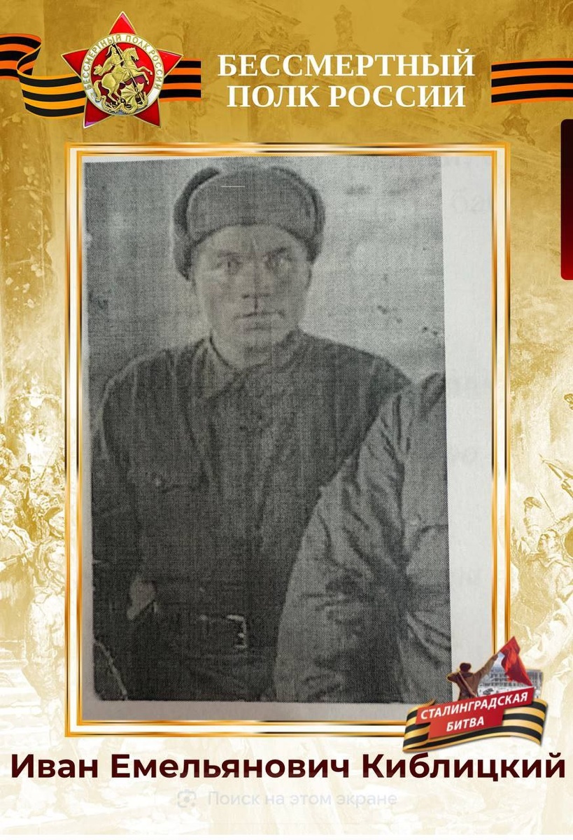 Иван Емельянович Киблицкий был призван в ряды танкистов в армию в 1942 году военкоматом города Актюбинск. Принял участие в битве за Сталинград. Сохранилась фотография тех лет. Он с друзьями. Оттуда же пришло извещение о его гибели. Отдал жизнь за Родину в великом бою.